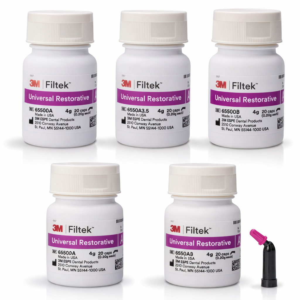 3M Filtek™ Universal Restorative is a light-cured nanocomposite designed for durable, natural-looking restorations in both anterior and posterior regions. Engineered with TRUE nanotechnology and low-stress monomers, it offers excellent strength, polish retention, and reduced polymerization shrinkage. The capsule delivery system ensures consistent handling, precise placement, and efficient clinical workflow.