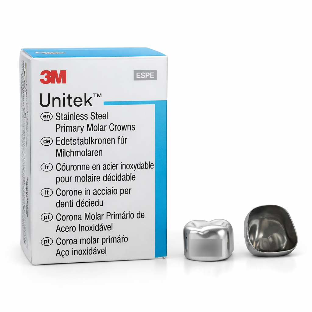 3M™ Unitek™ Primary Stainless Steel Crowns are prefabricated full-coverage crowns designed for reliable restoration of primary teeth in pediatric dentistry. Manufactured from high-quality stainless steel, these crowns provide durable protection and restoration for primary molars and anterior teeth affected by extensive caries or structural damage. The crowns are pre-trimmed and contoured to facilitate quick chairside placement while allowing clinicians to easily adapt and crimp the margins for precise fit and occlusal function.