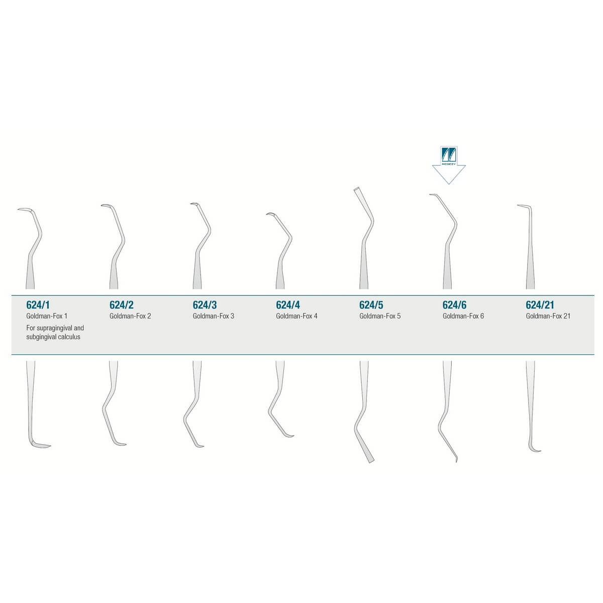 For the removal of sub-gingival calculus and for the root cleaning. Designed to work in all areas of the mouth with a semicircular tip used at 90° to the tooth root surface. Both sides of each blade can cut.