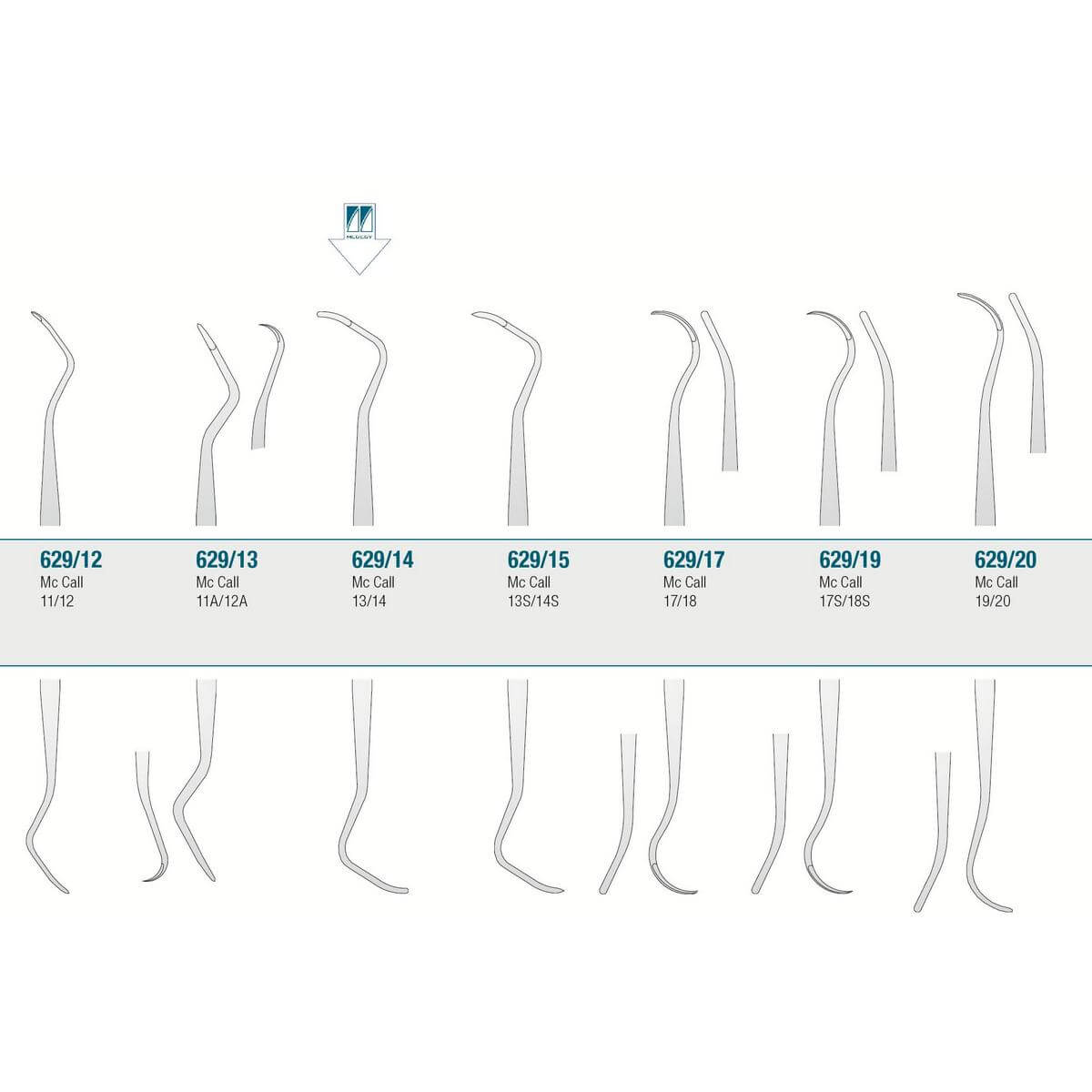 For the removal of sub-gingival calculus and for the root cleaning. Designed to work in all areas of the mouth with a semicircular tip used at 90° to the tooth root surface. Both sides of each blade can cut.