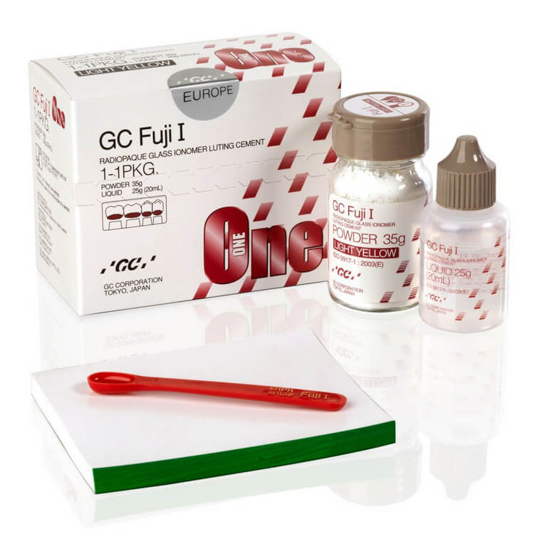 GC Fuji I Cement - 1:1 Package. Glass Ionomer Luting Cement. 35 Gm. Powder, 20 mL Liquid, Spatula and Mixing Pad