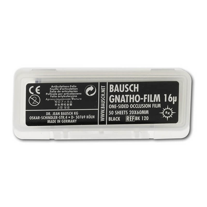 Bausch Gnatho-Film BK120 is a premium occlusion film designed for precise articulation checks in dental procedures. Measuring 20 x 60 mm and 16 microns thick, this black film offers exceptional tear resistance and flexibility. Its ultra-thin polyethylene base with a soft, hydrophilic wax coating ensures accurate marking of occlusal contacts, even on moist surfaces. Ideal for both static and dynamic occlusion assessments, each box contains 50 sheets, making it a reliable choice for dental professionals.