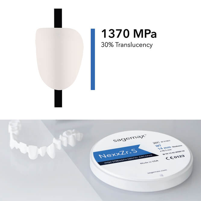 NexxZr S is a high strength, white zirconia disc block made of 3Y-TZP (zirconium oxide) material. It is specifically designed for the layering technique in dentistry and has a flexural strength of 1370 MPa, making it suitable for use in the fabrication of single tooth restorations up to multi-unit bridge frameworks. This zirconia block has a high opacity of 30%, giving it excellent optical properties for use in discolored stumps, metal posts, and cores. It also has a special production process that enhances its milling properties and results in accurate fit and high edge stability.