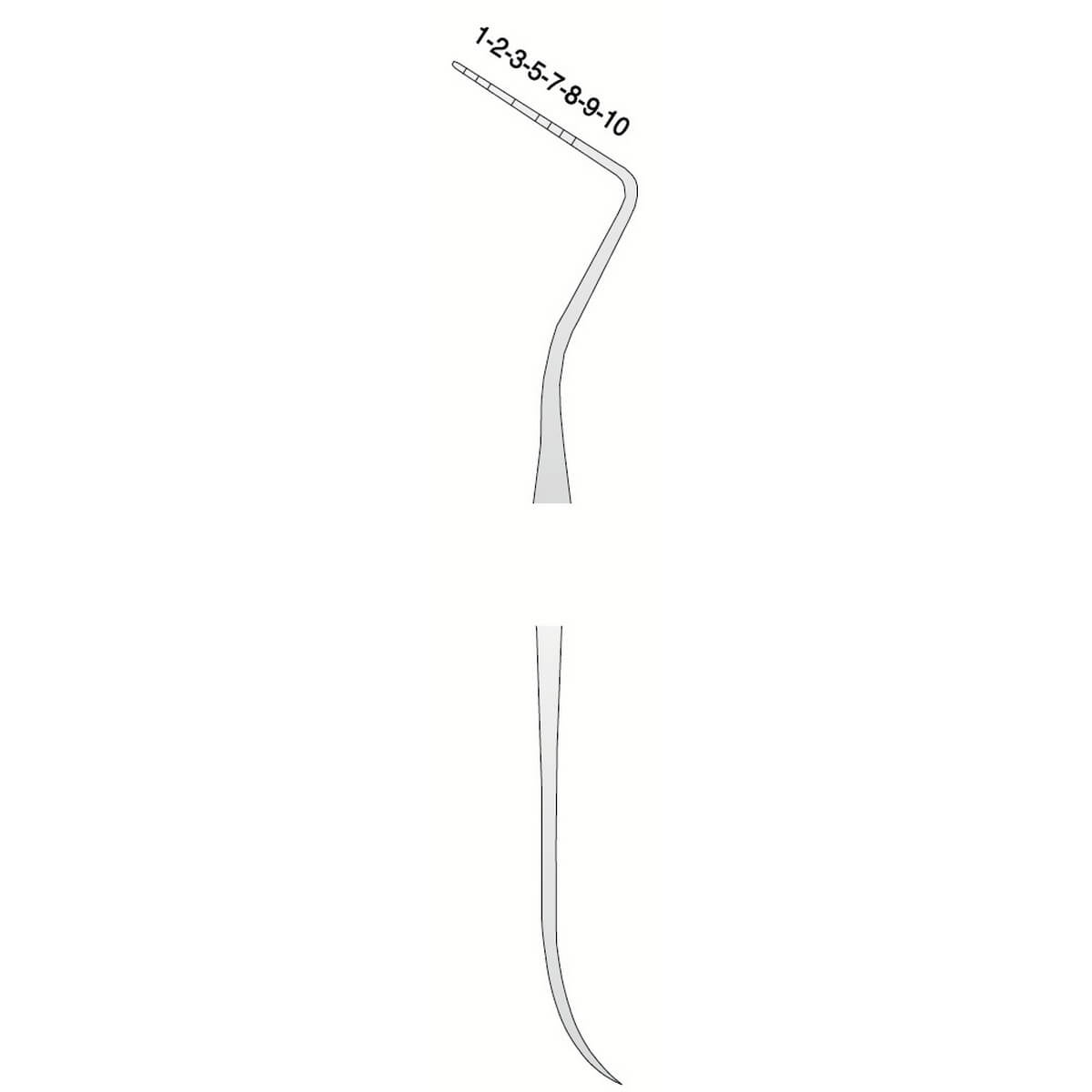 Markings: mm1-2-3-5-7-8-9-10 To measure pocket depths around a tooth in order to establish the state of health of the periodontium with its long, thin, and blunted tip. Color coded points used to measure periodontal pocket depth and attachment levels in millimeter increments.