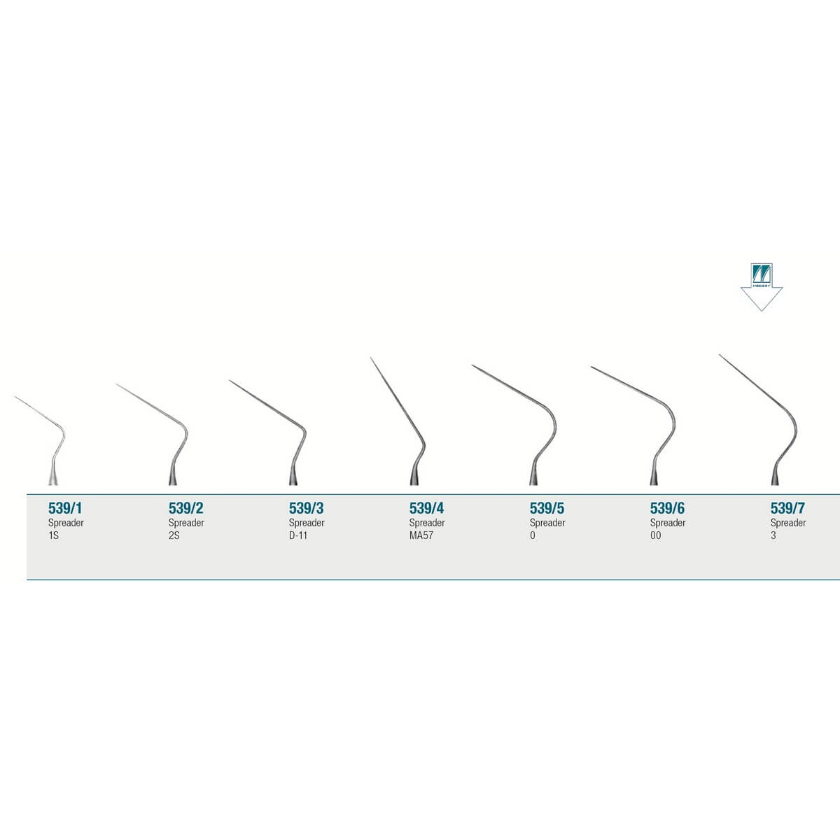 SPREADER: recognizable from its pointed tip and its stem, which is bended in many different ranges. The spreader is mostly used for the following applications: cold working to laterally compact the guttaperca into the endodontic canal; heat carrier to carry the heat into the endodontic canal through a previously heated tip.