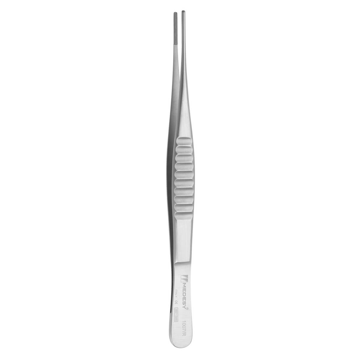 Used to facilitate grasping, manipulation, compression or joining of tissue and ligature. It typically has two main designs: 1) a self-retaining, scissors-like design with ring handles with the working end having a variety of blade designs, e.g., straight, angled, or curved with parallel grooves or serrations to provide grip; and 2) tweezers-like design (may be a micro/fine instrument) with two conjoined blade with serrated tips at the working end. Atraumatic tissue tweezer, for gripping membrane and tissue safely. The special serration prevents the perforation of the tissue.