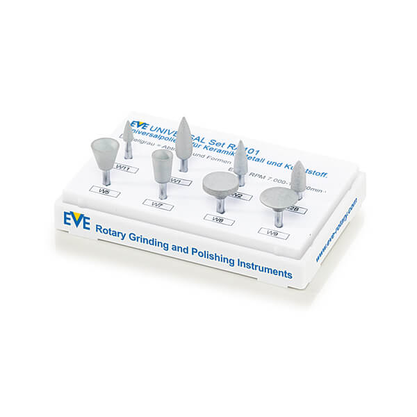 The UNIVERSAL All Dental Materials Smoothing Set is designed for the effective smoothing of various dental materials including porcelain, composite, precious metal, and amalgam. The set features soft silicone bonding that adapts to the surface being processed, ensuring optimal results across different materials.