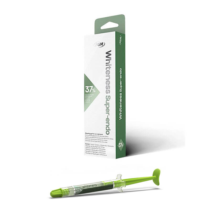 FGM's Whiteness Super-endo 37% CP is a carbamide peroxide-based intracoronal whitening gel designed specifically for the “walking bleach” technique in non-vital teeth. Its ready-to-use formulation and optimal consistency facilitate effective and controlled bleaching within the pulp chamber.