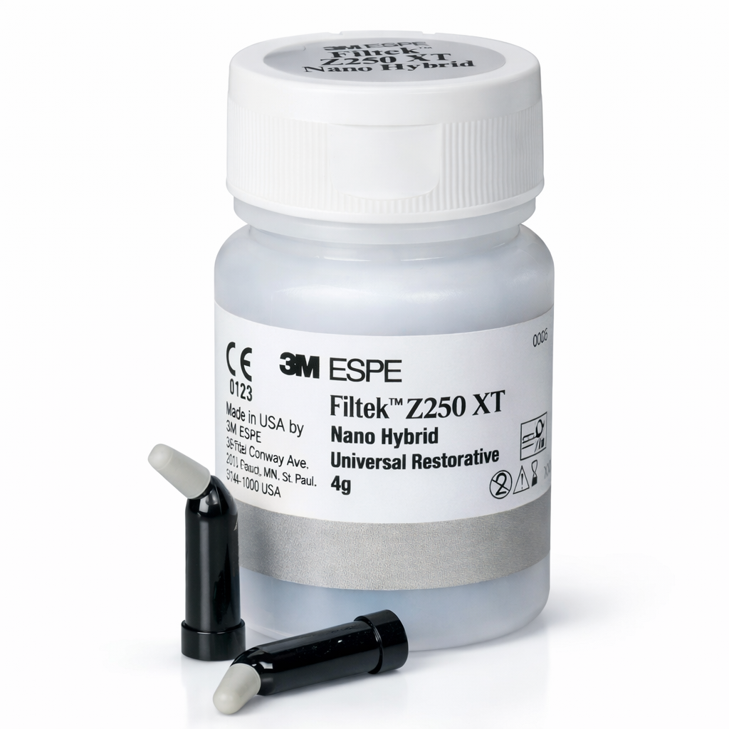 3M Filtek™ Z250 XT Nano Hybrid Universal Restorative is a light-cured nanohybrid composite designed for predictable performance in both anterior and posterior restorations. Combining a broad particle size distribution with nano-sized fillers, it delivers high strength, excellent wear resistance, and reliable esthetics. The material offers a balanced handling profile—non-sticky, sculptable, and resistant to slumping—making it suitable for a wide range of everyday restorative procedures.