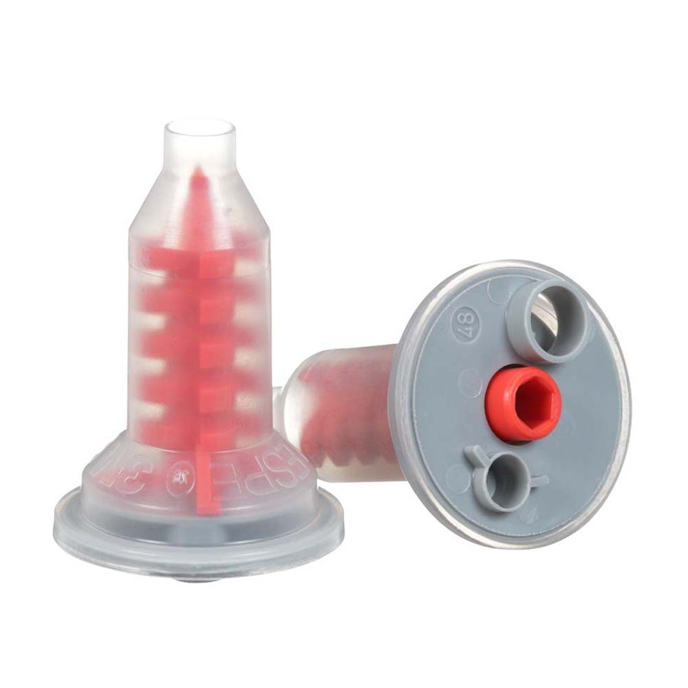High-volume red mixing tips designed for efficient and consistent blending with reduced material waste.