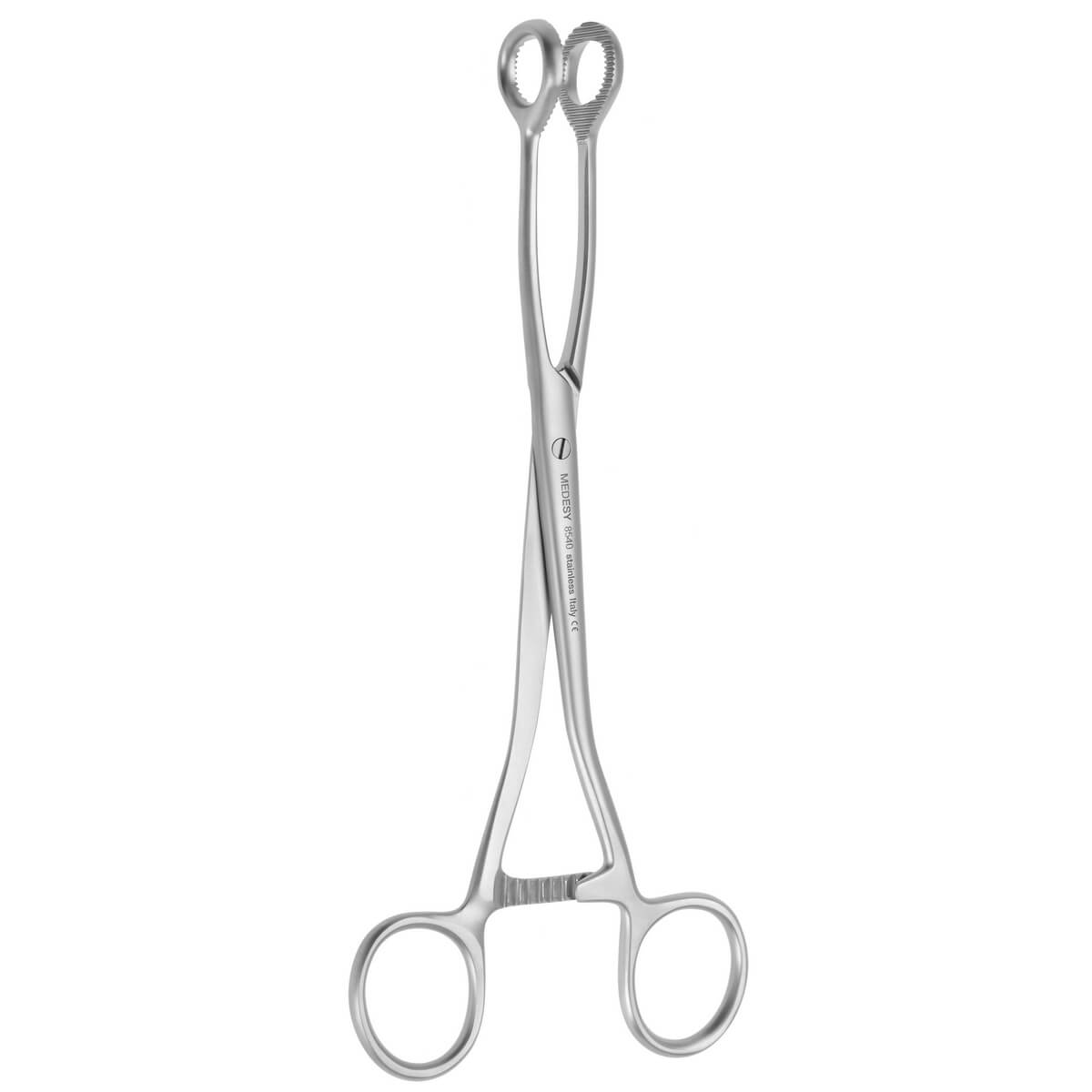 Used to facilitate grasping, holding or manipulation of the tongue during a surgical procedure. It typically has a self-retaining, scissors-like design with ring handles with the working end having a variety of blade designs, e.g., straight, angled, or curved with large loop-like grasping jaws that are serrated to provide grip; some may have exchangeable, serrated, rubber inserts functioning as the jaws.