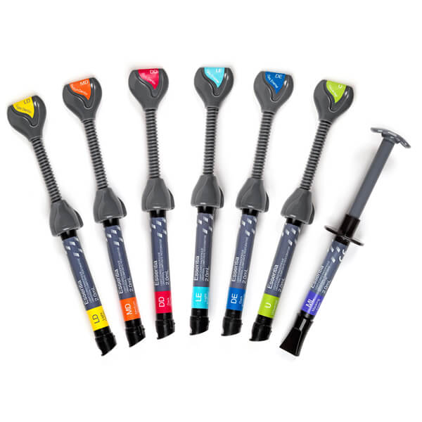 Starter Kit Syringe • 7 syringes, 1 of each shade: LD; MD; DD; LE; DE; U; ML • 20 Dispensing Tips • Accessories Essentia represents the pure essence of composite layering. With just seven syringes, you now have a perfect aesthetic solution for all your restorations. Traditional shade systems rely on different hues (colours), known as A, B, C and D. However, it is known that enamel and dentin have different characteristics which are also changing with time, becoming not only stronger in colour but also more translucent. By breaking away from traditional monochromatic shades and focusing on reproducing the aging characteristics of enamel and dentin, you can obtain a much more natural result in just two simple layers.