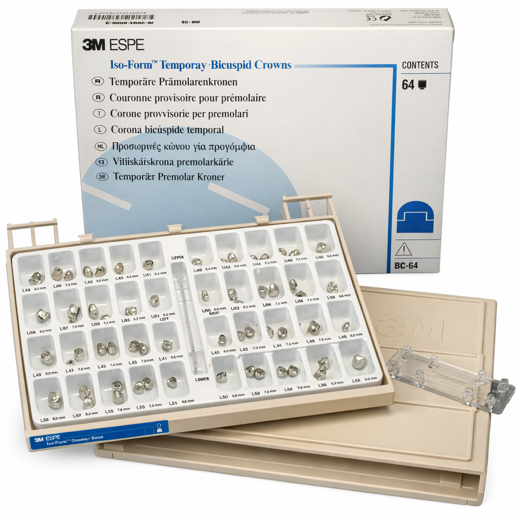 The Iso-Form Bicuspid Starter Set BC-64 provides clinicians with a complete provisional crown system for adult premolar restorations. Featuring prefabricated tin-silver crowns with anatomical contouring and a wide assortment of sizes, the kit supports fast placement, reliable marginal adaptation, and predictable temporary protection. Ideal for crown and bridge procedures, it streamlines provisionalization while maintaining tooth function and patient comfort until the definitive restoration is delivered.