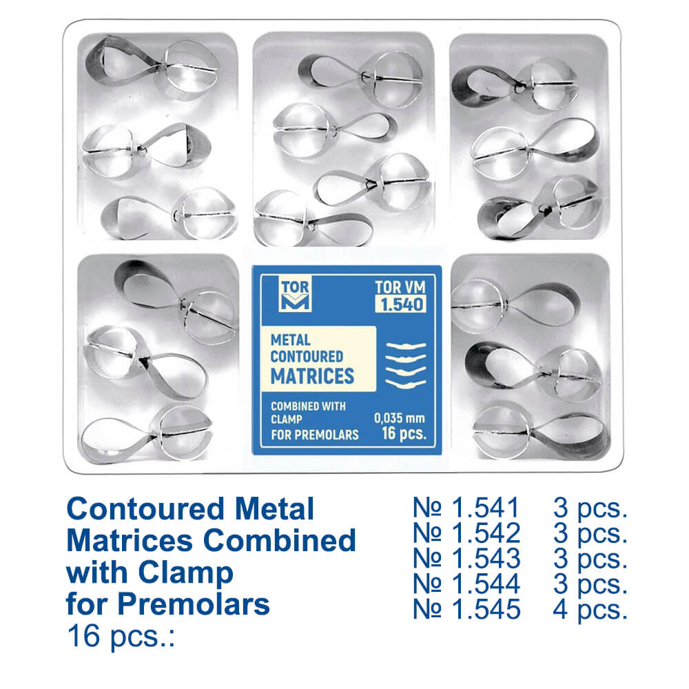 The Metal Contact Matrices with Clamp for Premolars are designed to provide secure adaptation during dental restorations. They enhance the quality of contact restorations, ensuring optimal results in premolar treatments.