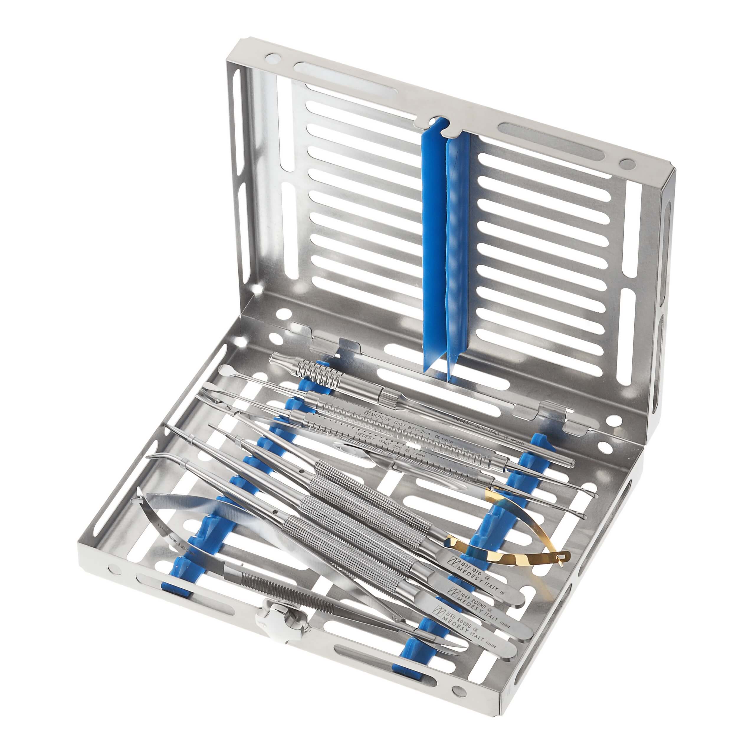HANDLE FOR MICRO-MIRRORS AND MICRO-BLADES SMOOTH, MICRO BLADES STERILE N.64 – 25 PCS, NEEDLE HOLDER CASTROVIEJO mm180 CURVED TC, SCISSOR CASTROVIEJO CURVED mm150, TWEEZER ROUND mm180 1×2, TWEEZER ROUND mm180 1×2 CURVED, TWEEZER DE BAKEY MINI, PERIOSTEAL ELEVATOR 3.3/2.8, PERIOSTEAL ELEVATOR MOLT 2-4, TRAY GAMMAFIX TRE