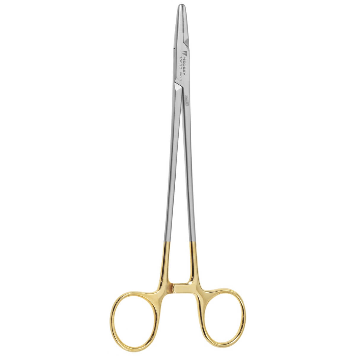 For needles: 2-0, 3-0, 4-0 Used to grasp suture needles during suturing when pushing/pulling the needle and suture through tissue. It has short serrated jaws at the distal end to provide better grip of the needle and it is available in a wide variety of sizes and designs, such as: 1) a self-retaining, scissors-like design with ring handles at the proximal end; 2) a tweezer-like design with bowed, hinged handles that are operated by squeezing them together; and 3) a heavy-duty pincer-like design. some types may utilize inserts made of hard materials (e.g., tungsten carbide) and include scissor blades.