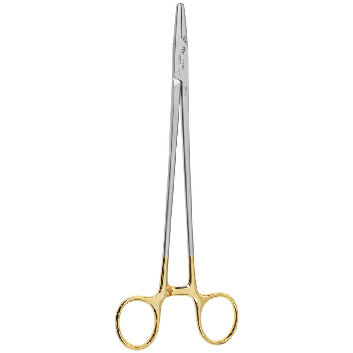 For needles: 2-0, 3-0, 4-0 Used to grasp suture needles during suturing when pushing/pulling the needle and suture through tissue. It has short serrated jaws at the distal end to provide better grip of the needle and it is available in a wide variety of sizes and designs, such as: 1) a self-retaining, scissors-like design with ring handles at the proximal end; 2) a tweezer-like design with bowed, hinged handles that are operated by squeezing them together; and 3) a heavy-duty pincer-like design. some types may utilize inserts made of hard materials (e.g., tungsten carbide) and include scissor blades.