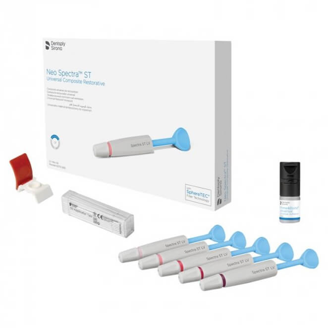 Neo Spectra ST - LV Syringe Universal Nano Composite Intro Kit is designed for dental restorations, offering a range of shades to match natural tooth color. The kit includes syringes of nano composite material that provide excellent esthetics and durability for various dental applications.