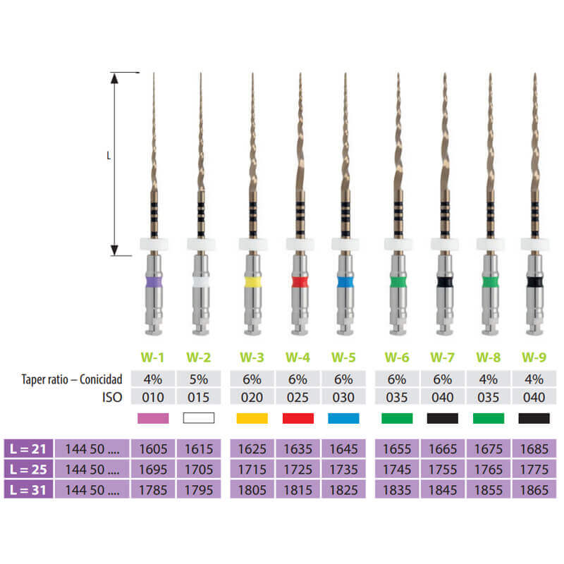 The NiTi Navigator Evo W-5 is designed for endodontic procedures, featuring a 0.06 taper and a length of 21mm. This design enhances canal shaping efficiency while minimizing the risk of procedural errors during root canal treatments.