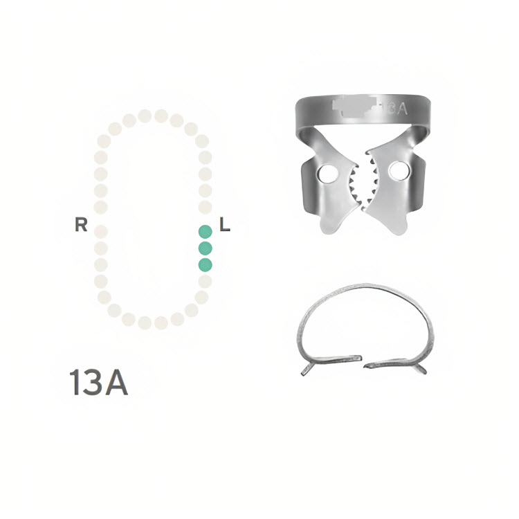 The Rubber Dam Clamp #13A is designed to securely hold the rubber dam in place on lower left molars. This enhances visibility and access during various dental procedures, contributing to improved clinical outcomes.