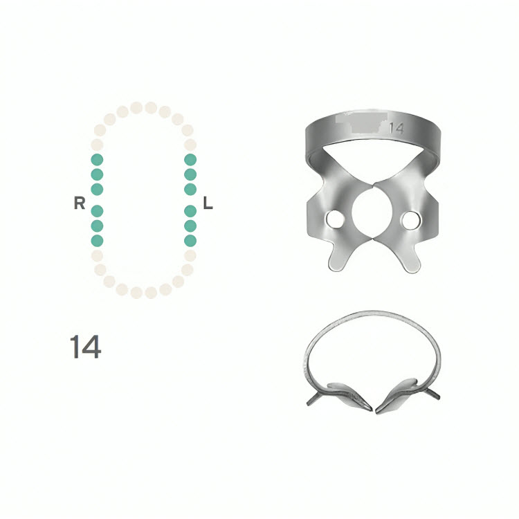 The Rubber Dam Clamp #14 is designed specifically for fully erupted molars. Its winged design provides secure stabilization, enhancing isolation and improving access during various dental procedures.