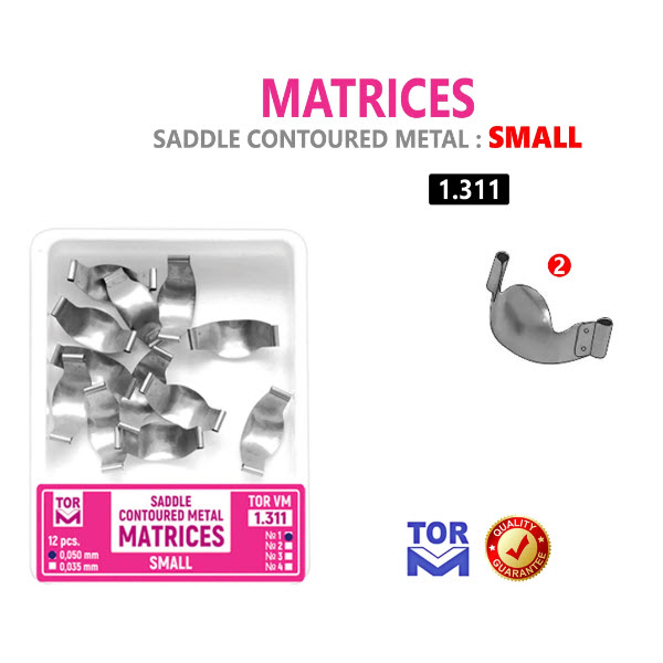 The Saddle Contoured Metal Matrice is designed to provide precise adaptation during dental restorations. Its adjustable central part allows for enhanced fitting to the tooth structure, contributing to improved restoration quality.